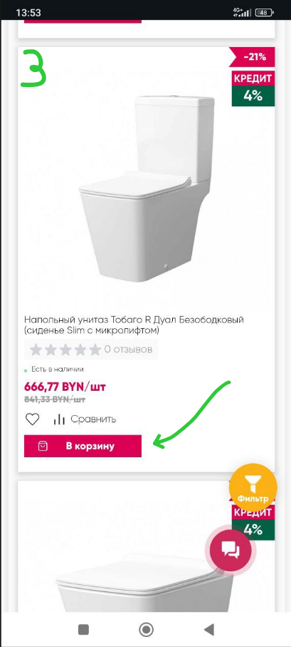 4. В карточке товара кнопка «Добавить в корзину» находится внизу экрана