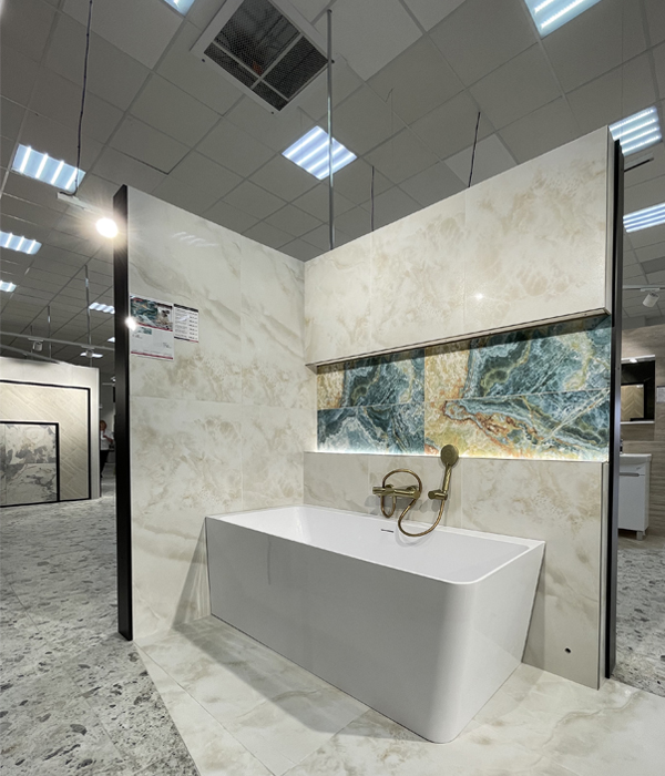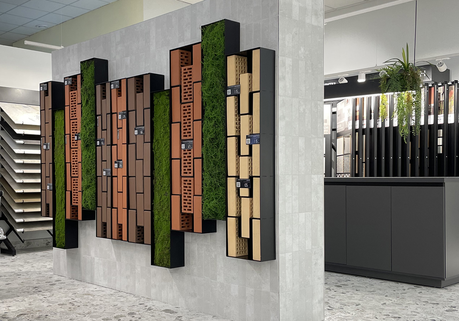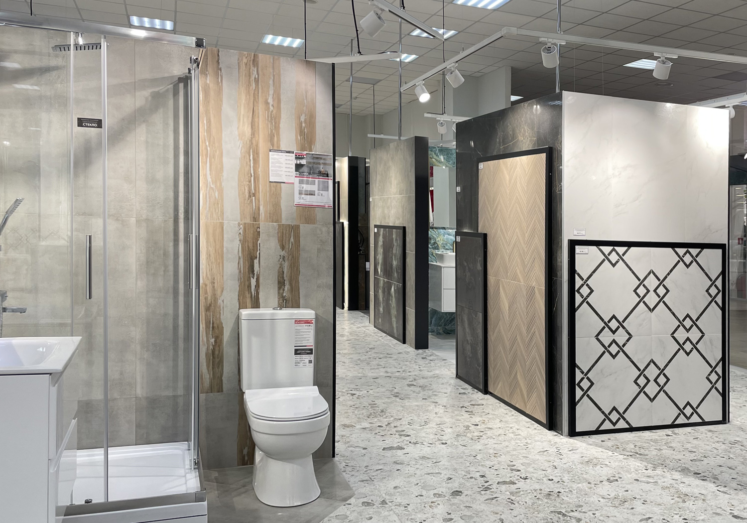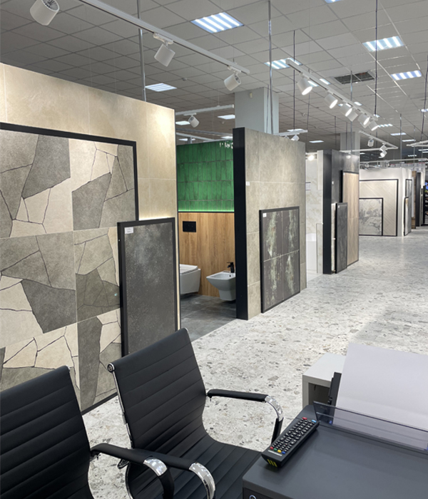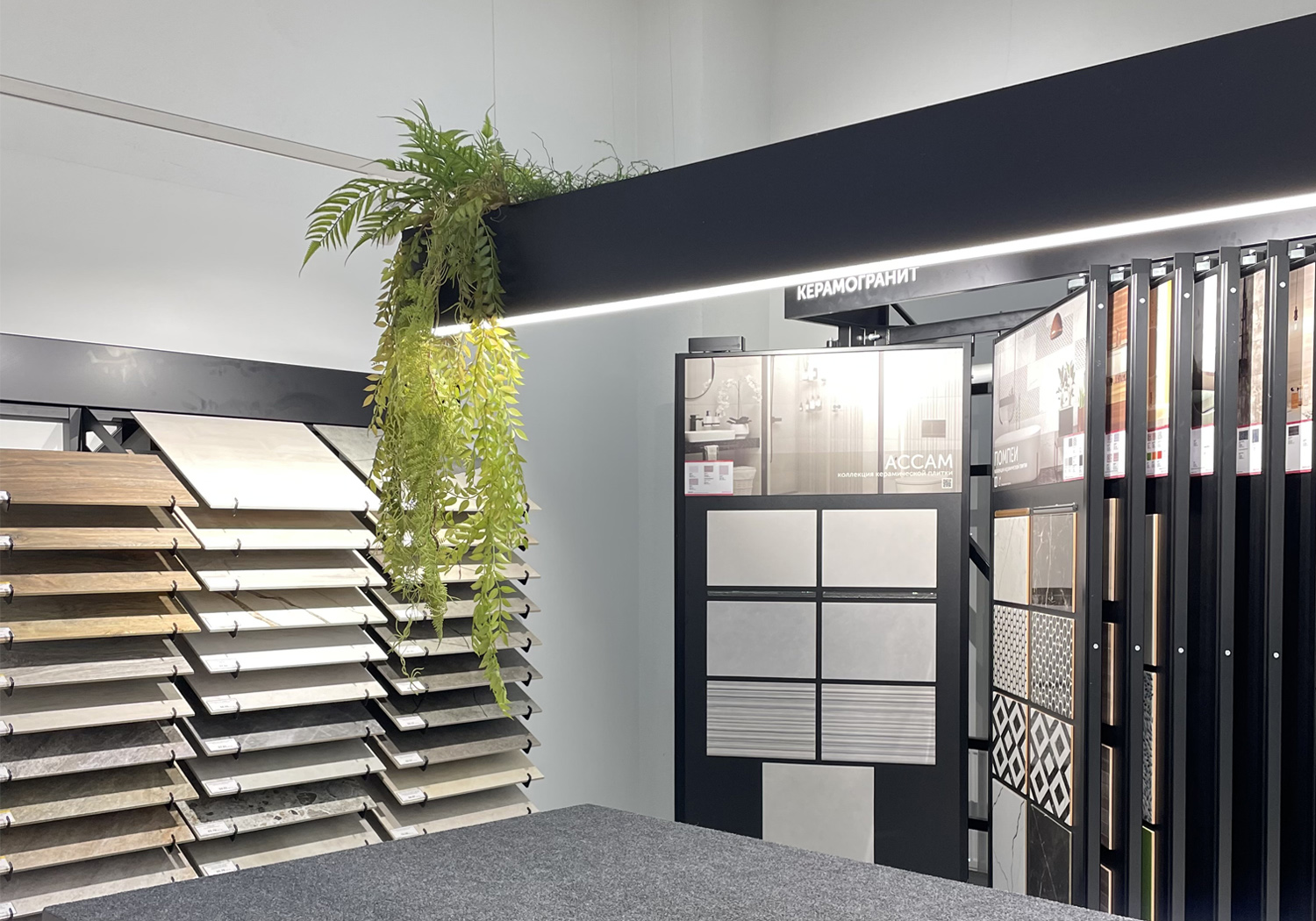Общая площадь салона составляет 400 м², на ней демонстрируется более 85 коллекций керамической и клинкерной плитки, керамогранита, более 90 моделей санитарной керамики. Представлены образцы мебели, клинкерной брусчатки, кирпича и всевозможные сопутствующие товары – от клея для плитки до уникальных дизайнерских смесителей для ванных комнат. Формат представленности продукции предполагает «живые» элементы помещений, полностью воплощающие реальные интерьеры с готовыми решениями. В первую очередь в демонстрационных кабинах размещены новинки керамической плитки – коллекции 2024 года. Полное ощущение реального помещения помогают создать элементы мебели и санитарной керамики, которые подобраны именно для конкретной локации и коллекции. Удобное зонирование помещения позволяет легко ориентироваться в салоне и делать выбор удобно – отдельная зона кирпича, широкоформатной плитки и сопутствующей продукции. Ассортимент продукции обширный и покупатель всегда может подобрать на свой вкус и кошелек нужную коллекцию, а стендовое оборудование позволяет продемонстрировать всю товарную программу, которая не представлена в интерьерных кабинах.