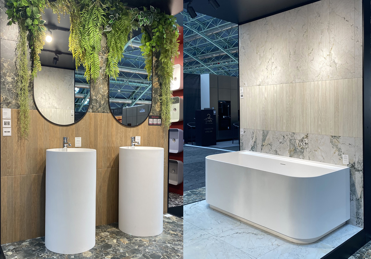 В центральной части стенда размещены пьедесталы с образцами умывальников, позволяющие посетителям рассмотреть новинки 2025 года со всех сторон. Кроме того, умывальники коллекции «Арена» были оригинально представлены в виде светильников, расположенных над ними. Такая необычная идея демонстрации санитарной керамики пришлась по вкусу посетителям, и многие взяли её на заметку.