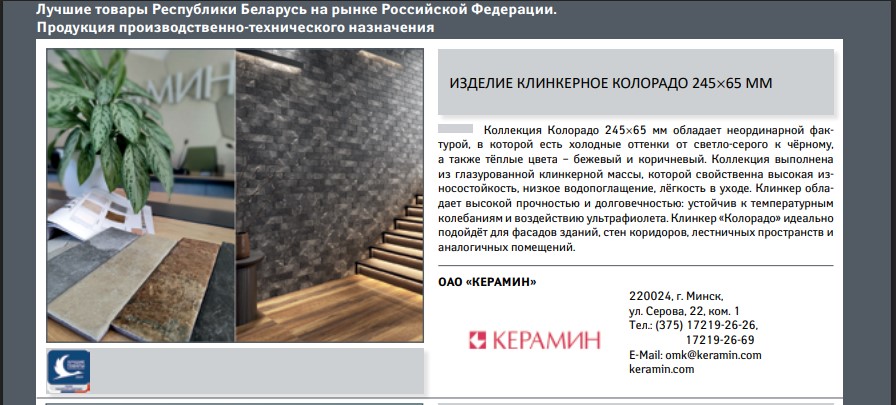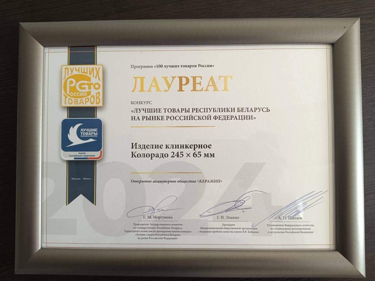 Клинкерное изделие Колорадо 245х65 мм стало лауреатом Всероссийского конкурса Программы «100 лучших товаров России» 2024 года.