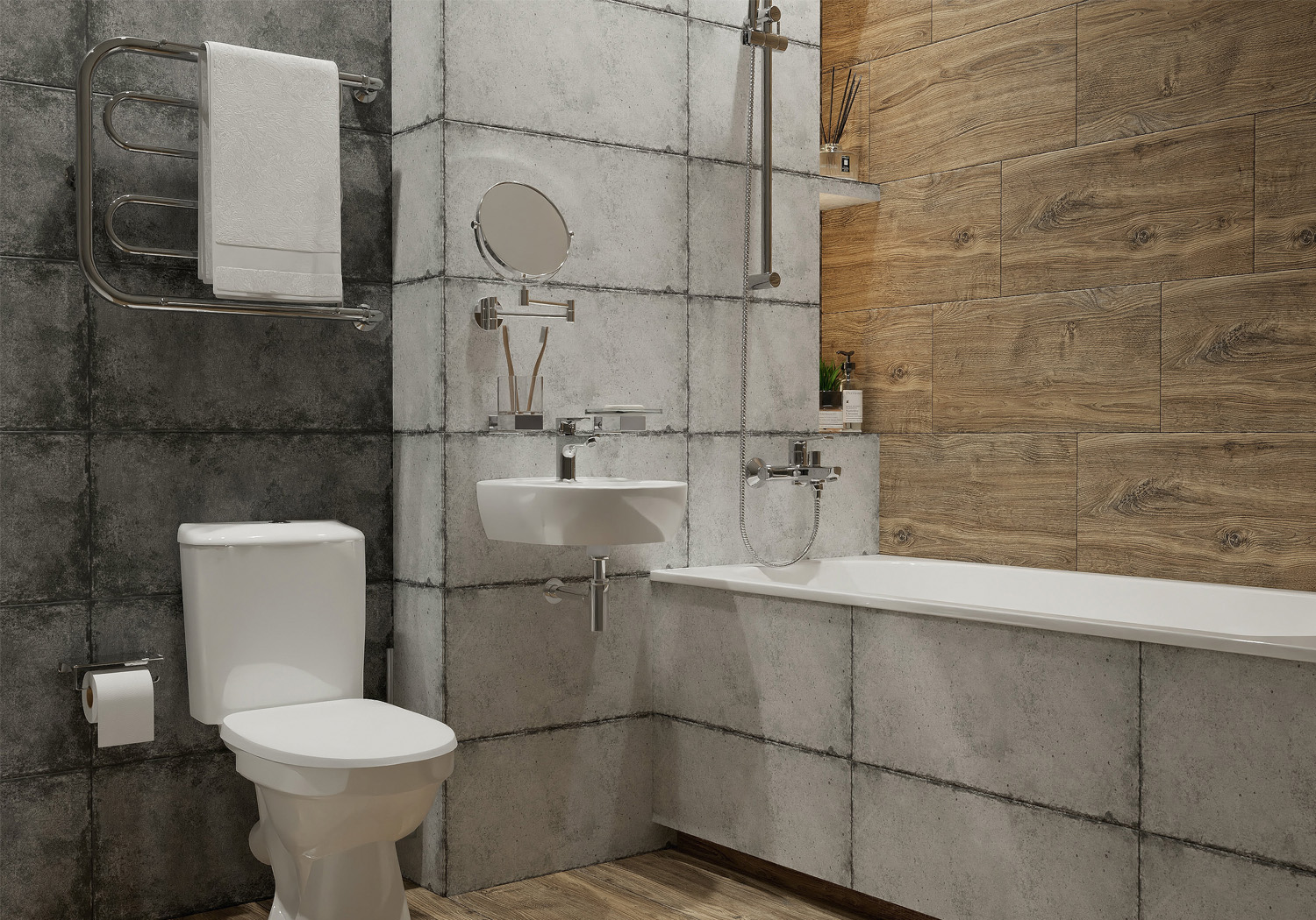 • Практичность: керамогранит с имитацией бетона и дерева долговечен, устойчив к влаге и легко моется. Это идеальное решение для ванной комнаты!