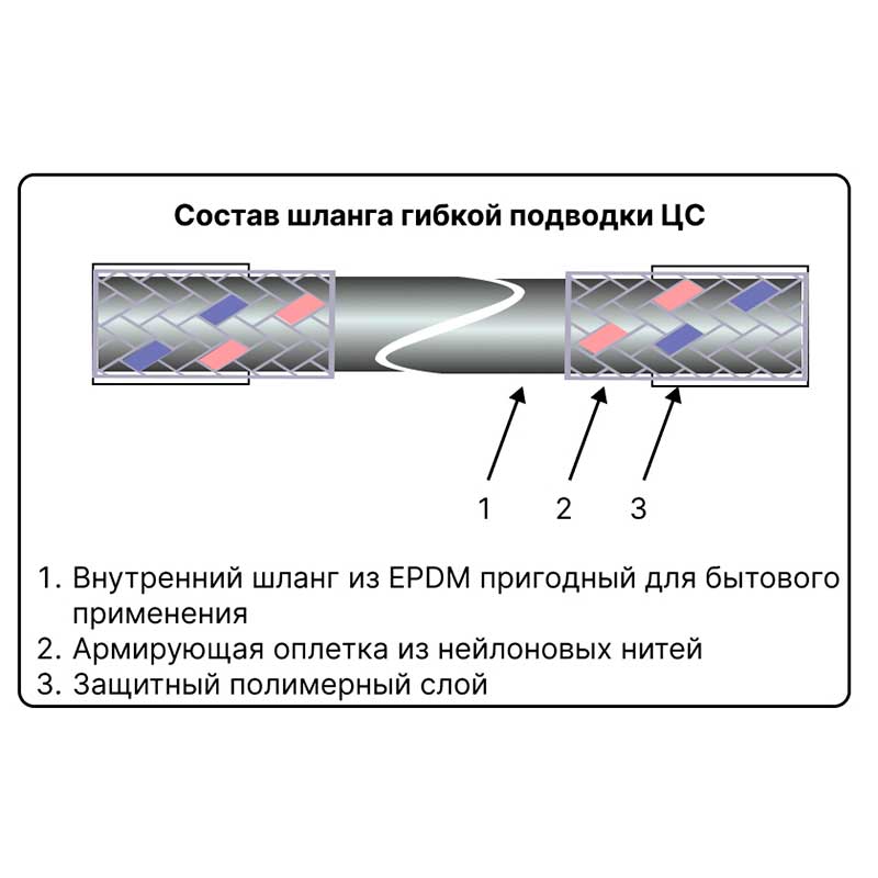 ГИБКАЯ ПОДВОДКА ДЛЯ ВОДЫ НЕИЛОНОВАЯ — новое поколение товаров в категории гибких трубопроводов. Преимущество этой продукции — шланг (рукав) из полимерных материалов, что является оригинальной разработкой производителя. Трубка ЕРDМ — армирована нейлоновыми нитями, имеет термостойкое полимерное покрытие. Позволяет использовать изделие в сложных условиях монтажа и эксплуатации. Из-за меньшей теплопроводности, по сравнению с шлангами с нержавеющей нитью, не конденсирует на себя влагу и не подвержен коррозии. Не подвержен воздействию блуждающих токов. Значительно увеличивает срок службы, способствует поддержанию пространства для инженерных коммуникаций в чистом и сухом состоянии, имеет привлекательный внешний вид .Применяется в качестве трубопроводов для подачи жидких смесей, к которым материал химически стоек. Используется в системах хозяйственно-питьевого водоснабжения жилых и промышленных зданий. Значительно увеличивает срок службы, способствует поддержанию пространства для инженерных коммуникаций в чистом и сухом состоянии, имеет привлекательный внешний вид. Применяется в качестве трубопроводов для подачи жидких смесей, к которым материал химически стоек. Используется в системах хозяйственно-питьевого водоснабжения жилых и промышленных зданий.