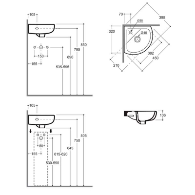 Ширина, мм450Глубина, мм395Высота, мм106КоллекцияМатериалфарфорФормаугловаяМонтажподвесной, на пьедесталЦветбелыйГарантия5 летОтверстие для смесителядаВес единицы:7.69Поверхность:Глянцевая