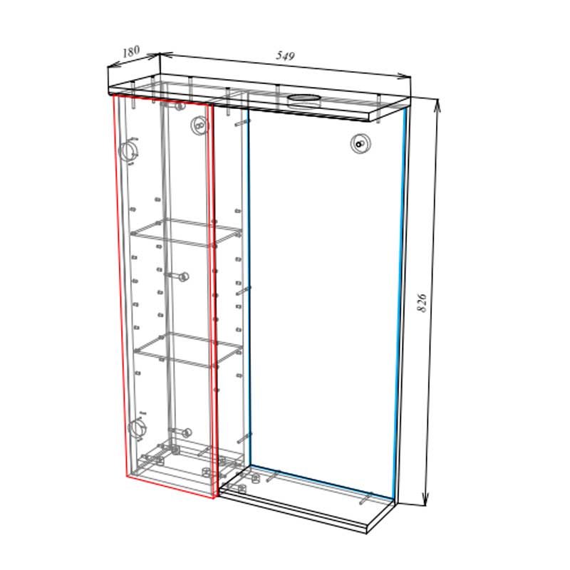 Шкаф с распашной дверью на петлях с доводчиком, открытие за нижнюю часть фасада, одно отделение 182мм, внутри 2 полки – стекло 4мм,