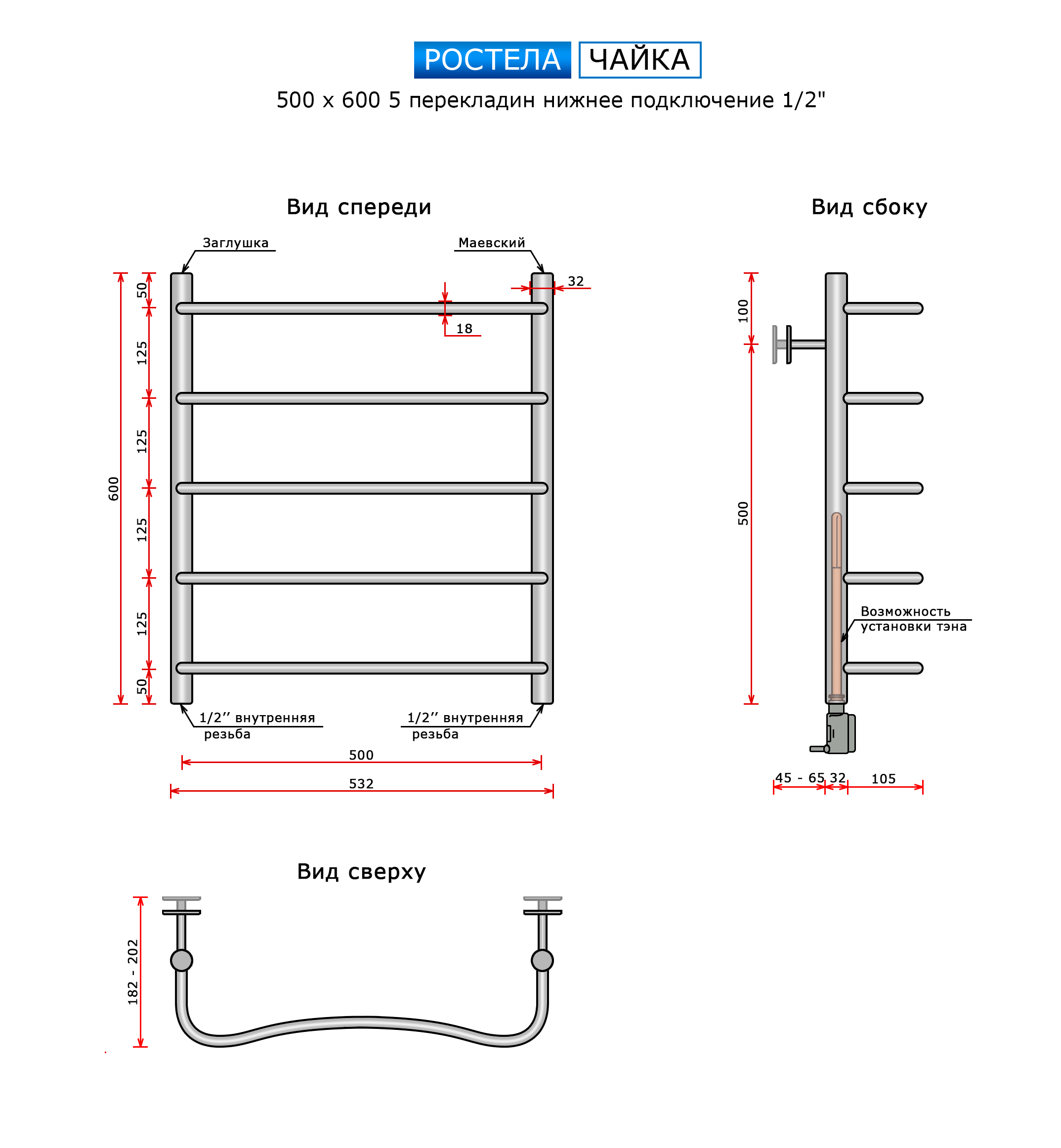 Способ нагреваполотенцесушитель водянойМатериалнержавеющая стальФормалесенкаШирина, мм532Высота, мм600Межосевое расстояние500Диаметр подключения1/2"Диаметр трубы18мм, 32ммТип подключениянижнееРезьба (наружная/внутр)внутренняяЦветхромПокрытиеполированный (блестящий)Поворотные секциинетГарантия5 летСтранаБеларусьПроизводительРостелаВес единицы:4.10