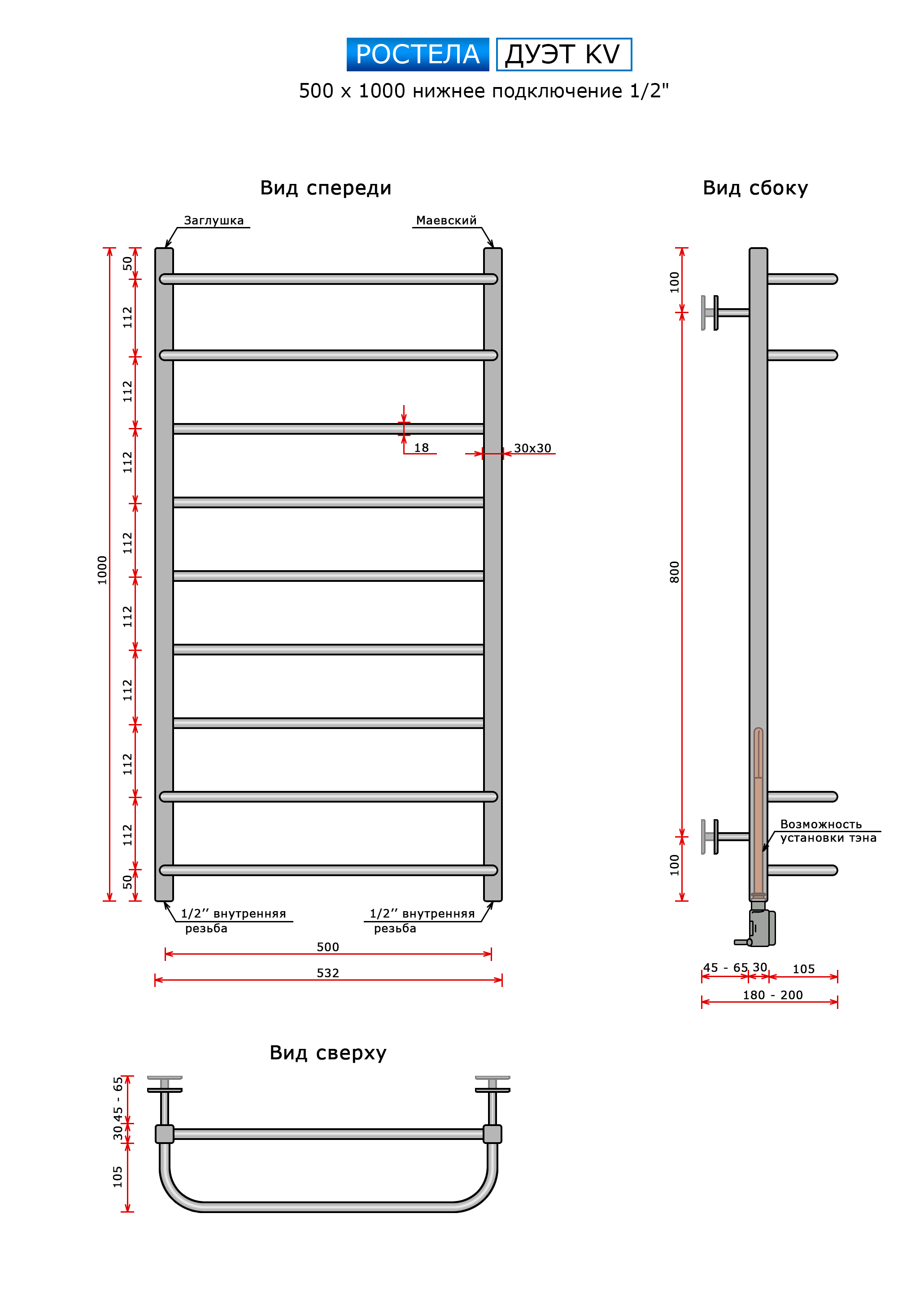 Способ нагреваполотенцесушитель водянойМатериалнержавеющая стальФормалесенкаШирина, мм530Высота, мм1000Межосевое расстояние500Диаметр подключения1/2"Диаметр трубы30 ммРезьба (наружная/внутр)внутренняяЦветхромПокрытиеполированный (блестящий)Поворотные секциинетГарантия5 летПроизводительРостелаВес единицы:6.10