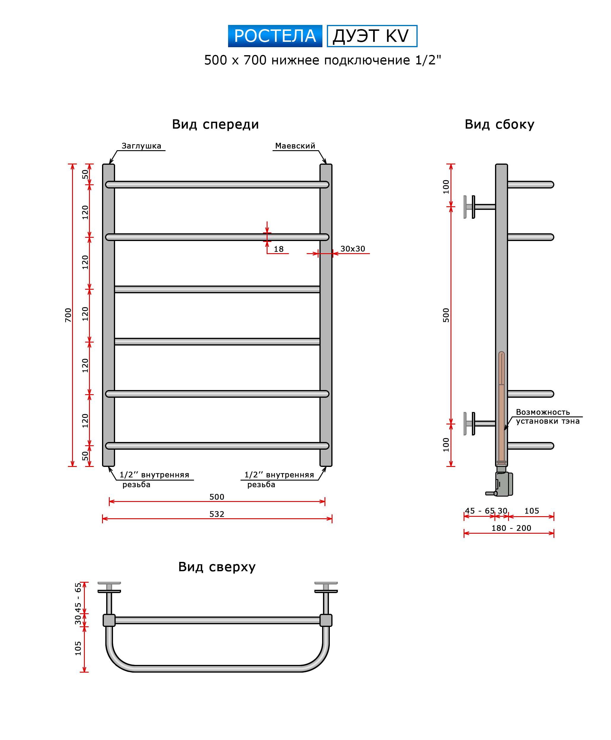 Способ нагреваполотенцесушитель водянойМатериалнержавеющая стальФормалесенкаШирина, мм530Высота, мм700Межосевое расстояние500Диаметр подключения1/2"Диаметр трубы30 ммРезьба (наружная/внутр)внутренняяЦветхромПокрытиеполированный (блестящий)Поворотные секциинетГарантия5 летПроизводительРостелаВес единицы:4.60