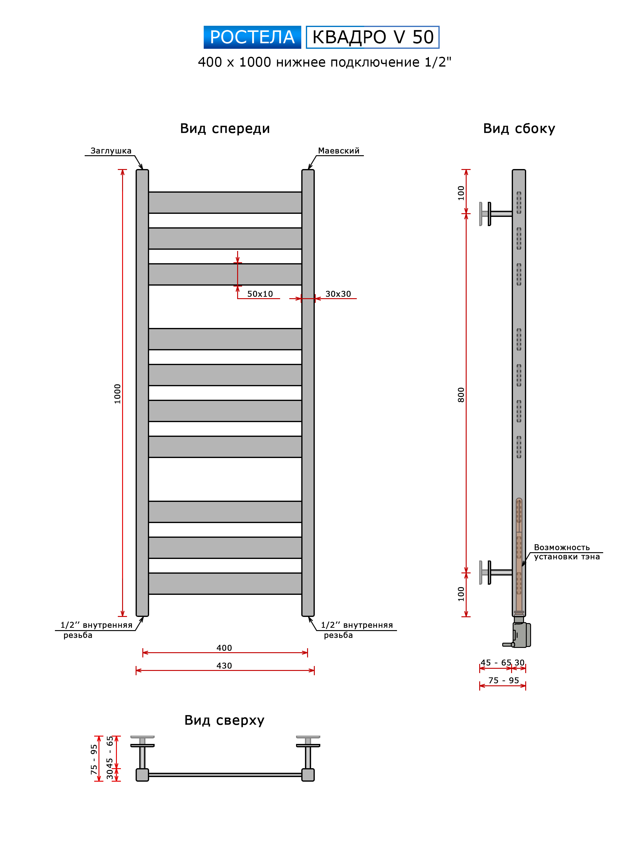 Полотенцесушитель водяной Ростела Квадро V 50 400 х 1000 / 10