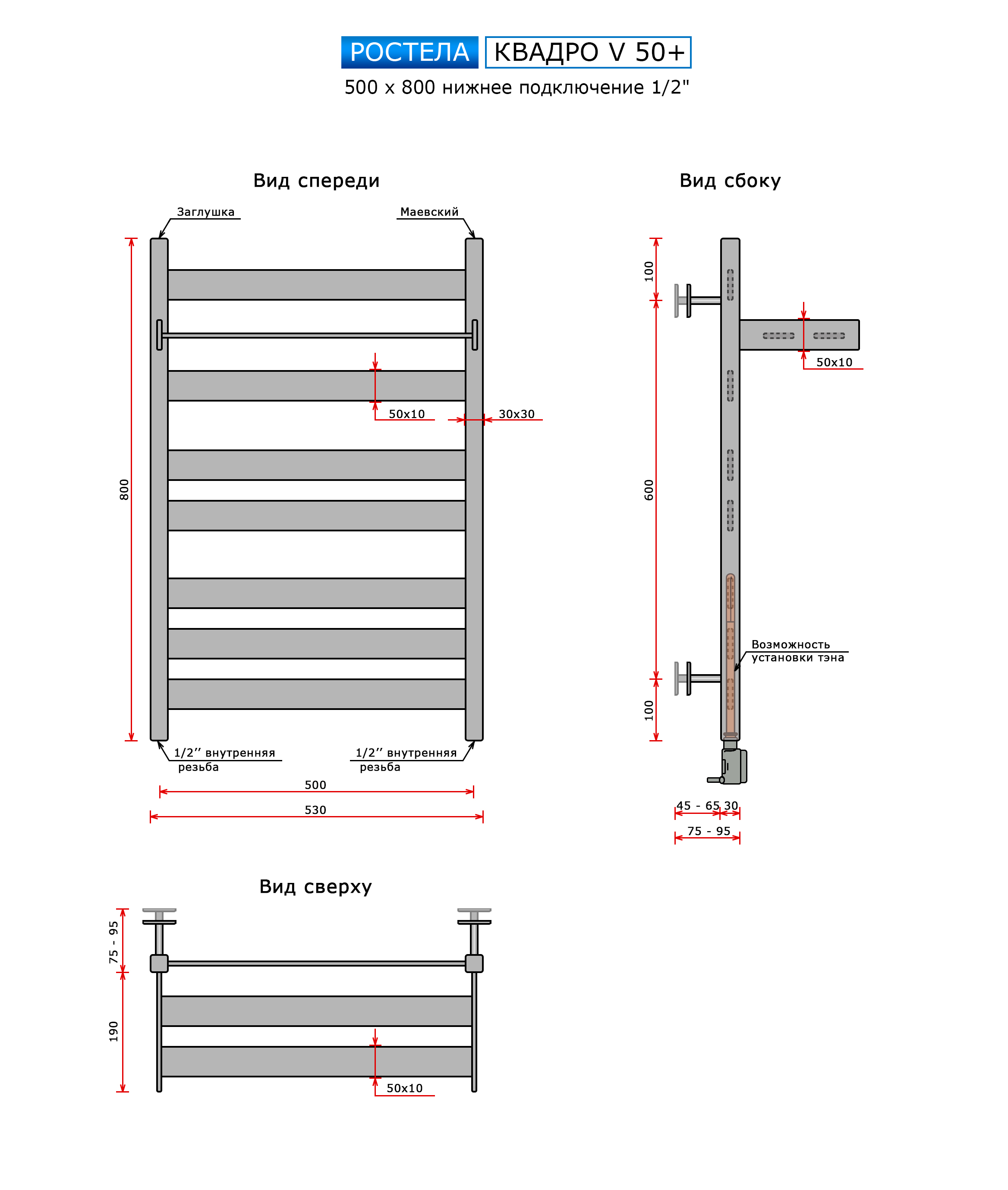 Полотенцесушитель водяной Ростела Квадро V 50 + 500 х 800 / 9
