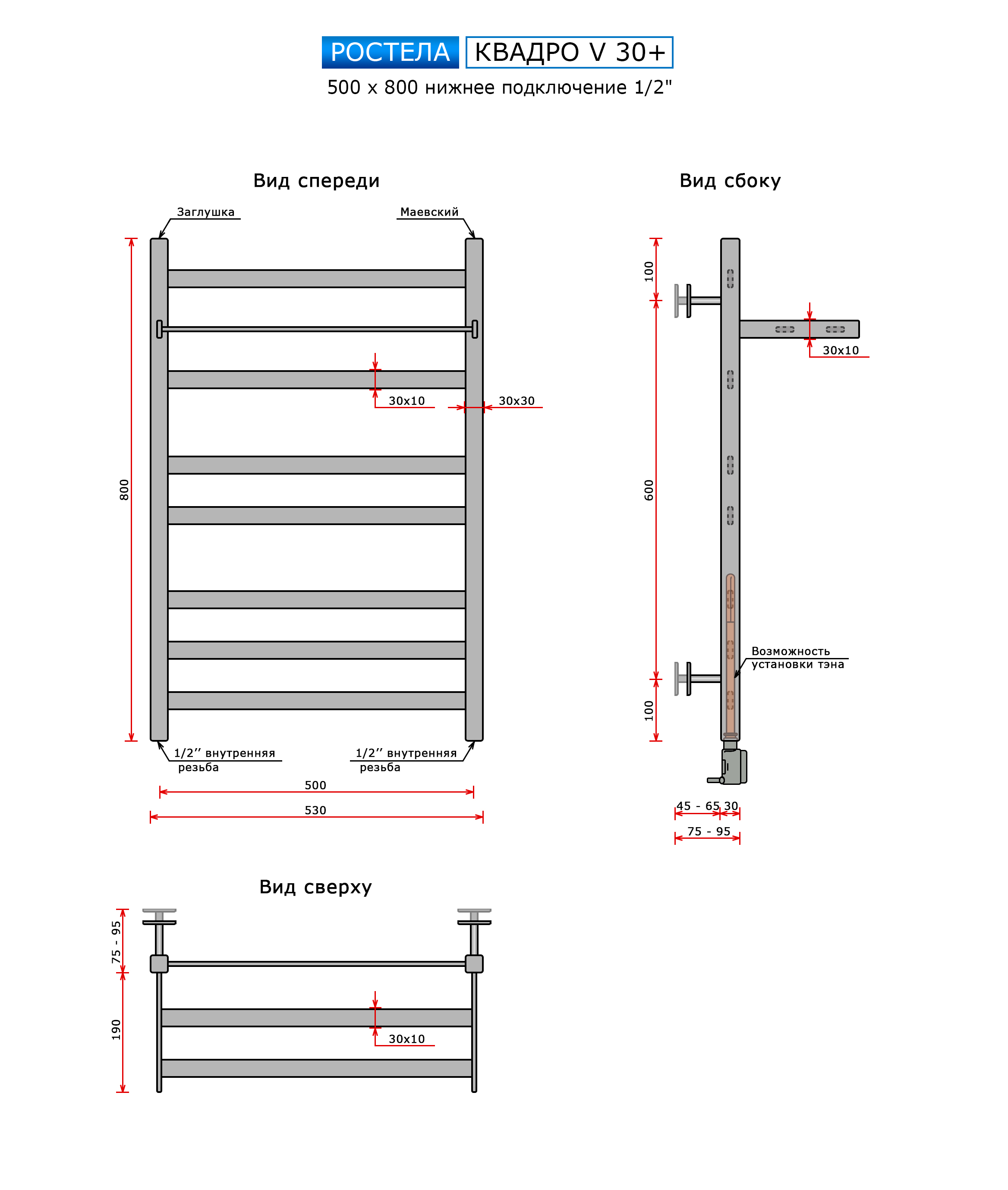 Полотенцесушитель водяной Ростела Квадро V30+ 500х800/9 (1/2")