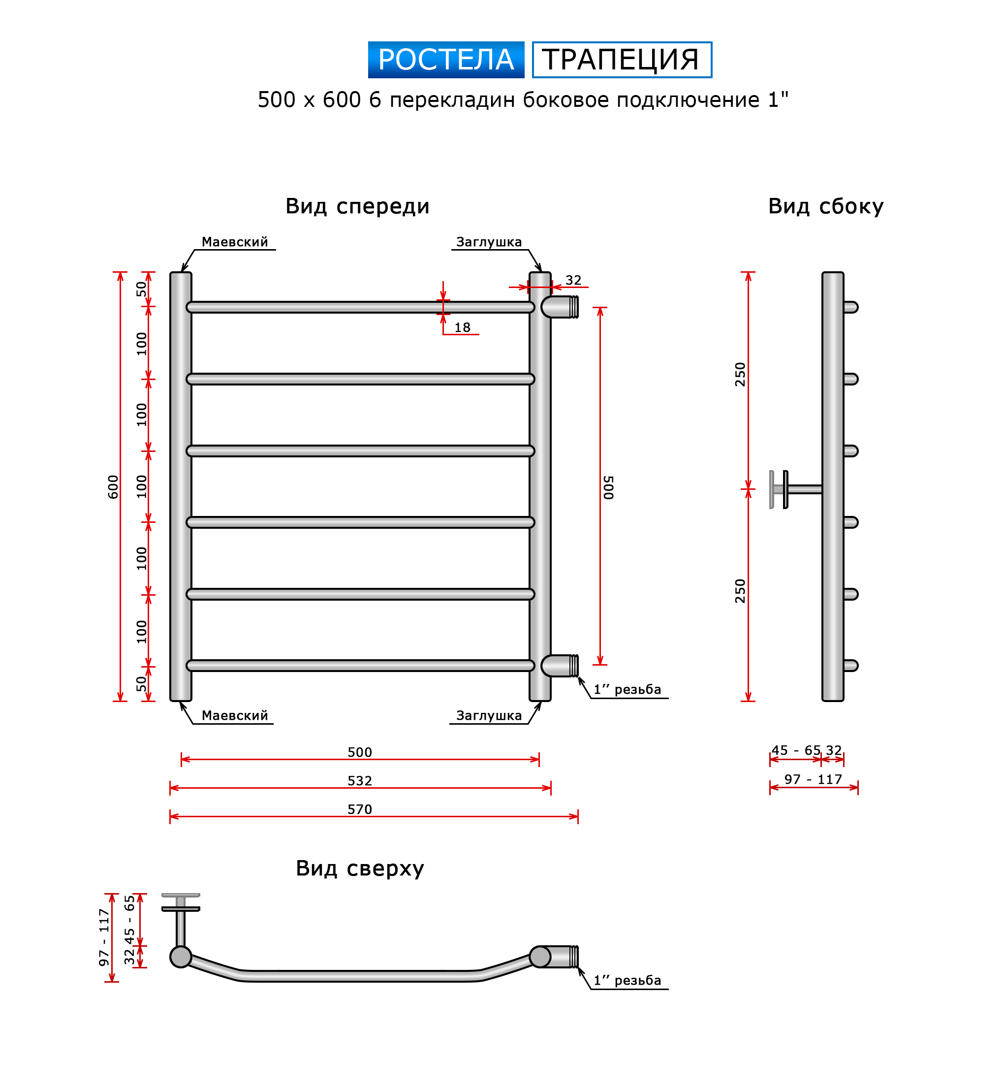 Полотенцесушитель водяной Ростела Трапеция люкс (боковое подключение 1") 500*600/6 купить в Минске по доступной цене в интернет-магазине keramin.by