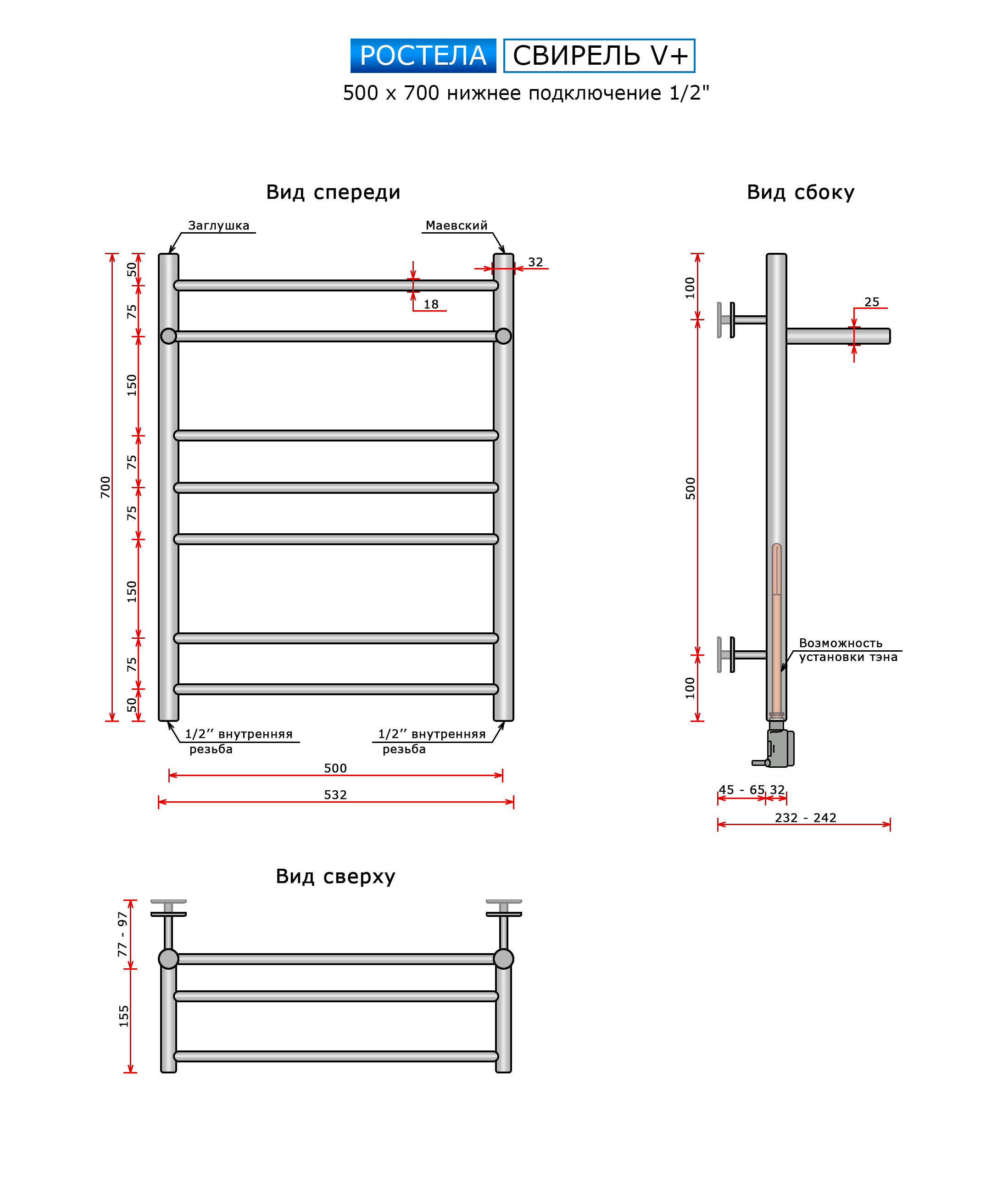 Способ нагреваполотенцесушитель водянойМатериалнержавеющая стальФормалесенкаШирина, мм532Высота, мм700Межосевое расстояние500Диаметр подключения1/2"Диаметр трубы32ммРезьба (наружная/внутр)внутренняяЦветхромПокрытиеполированный (блестящий)Поворотные секциинетГарантия5 летПроизводительРостелаВес единицы:4.90