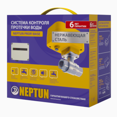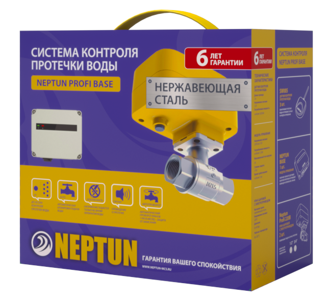 Система контроля протечки воды Neptun Profi Base предназначена для своевременного обнаружения и локализации протечек воды в системе водоснабжения и отопления жилых домов, коттеджей, офисных зданий, магазинов. Система заблокирует подачу воды до устранения причин протечки и проинформирует о возникшей аварии звуковым и световым сигналами.В состав комплекта входят: