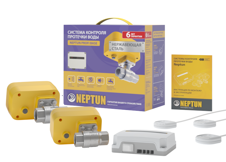 Система контроля протечки воды Neptun Profi Base предназначена для своевременного обнаружения и локализации протечек воды в системе водоснабжения и отопления жилых домов, коттеджей, офисных зданий, магазинов. Система заблокирует подачу воды до устранения причин протечки и проинформирует о возникшей аварии звуковым и световым сигналами.В состав комплекта входят: