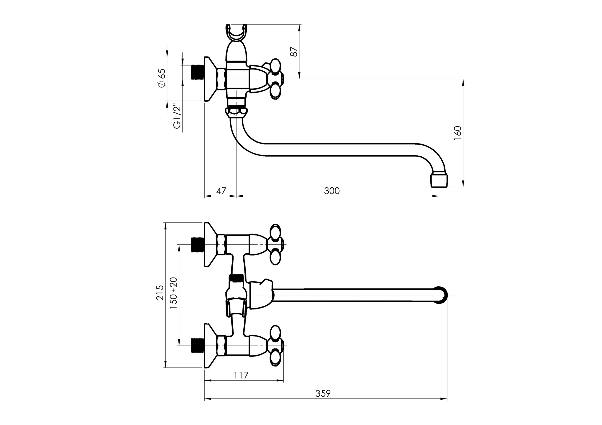Излив “S” 18x300 мм, керамические кран буксы (угол вращения 180°), эксцентрики с тарелочками, душевой шланг Con/Imp 150 см, душевая лейка Sweet.