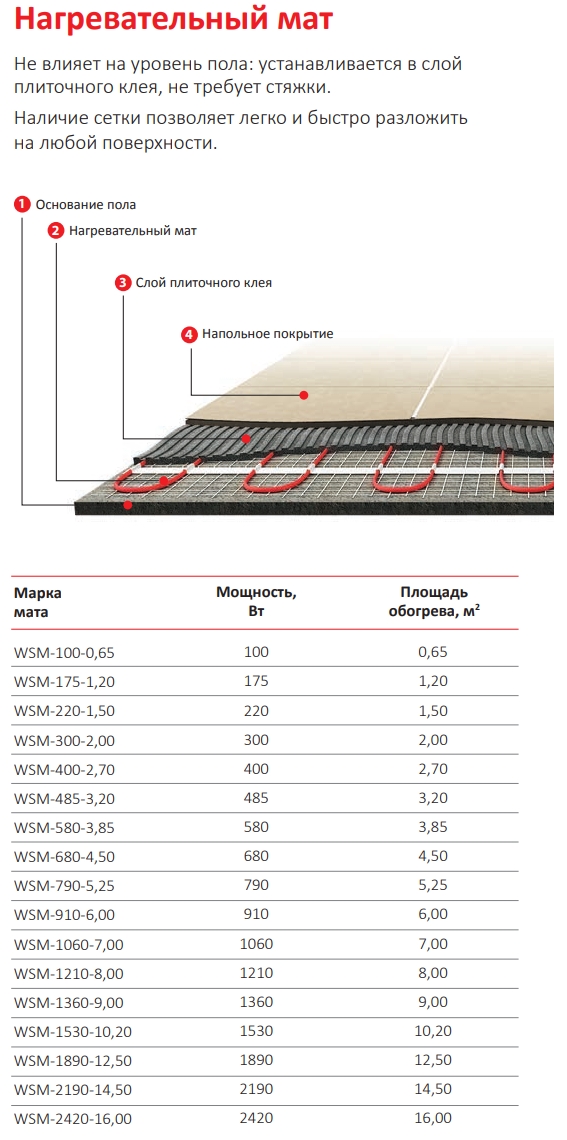 Теплый пол на основе двухжильных нагревательных матов Warmstad WSM может применяться для комфортного обогрева помещения при наличии основной системы отопления.Характеристики: