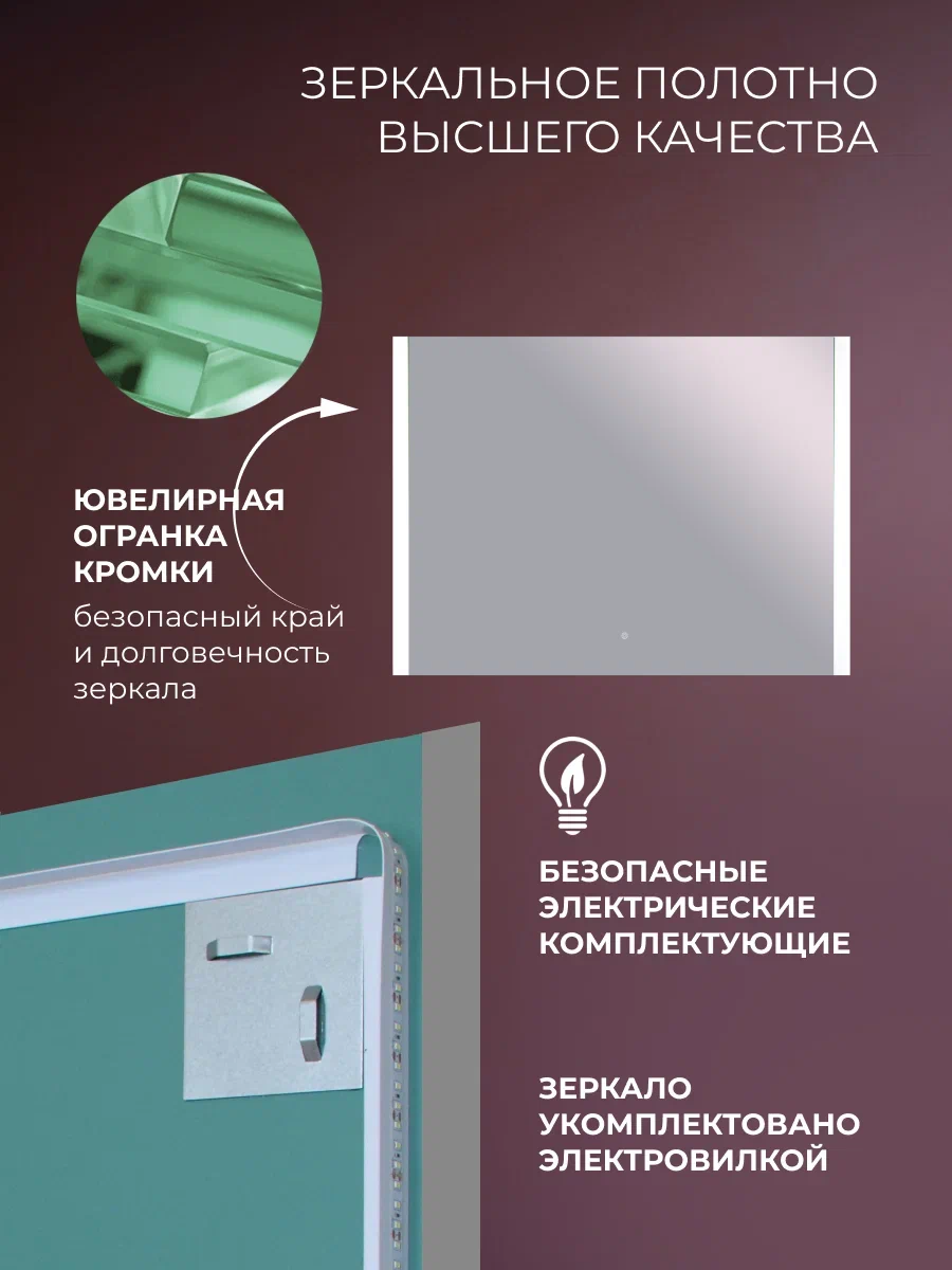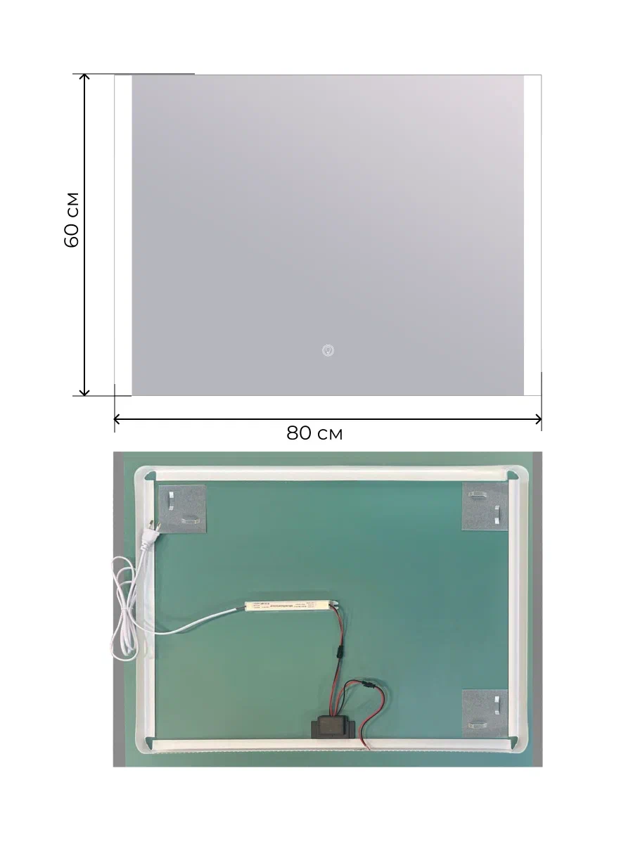 Зеркало с подсветкой Дублин Лайт 80х60 с регулировкой яркости подсветки, сенсор на касание, подсветка внутри полотна по всему периметру зеркала: монтаж зеркала вертикальный/горизонтальный, направленный свет для комфортного использования зеркала при нанесении макияжа/бритье и т.д,, не искажает тон кожи.