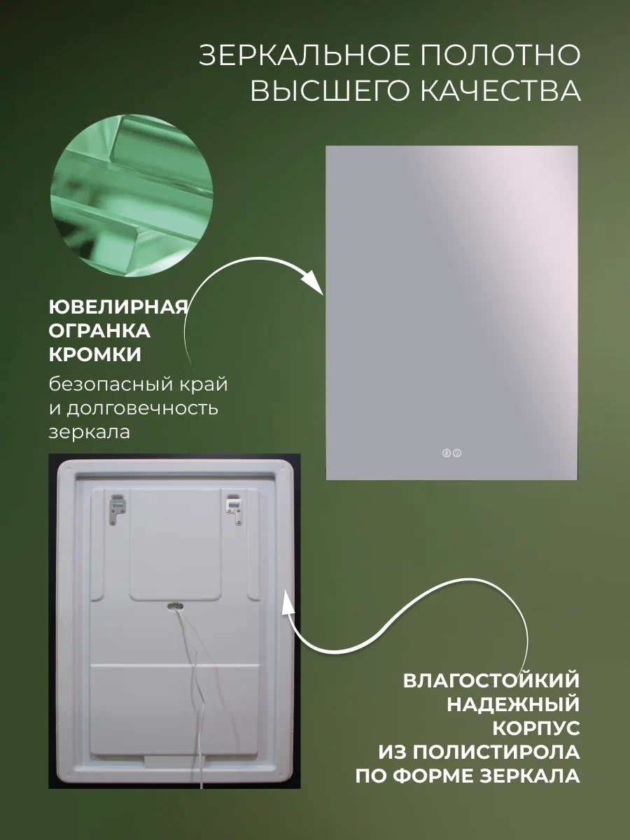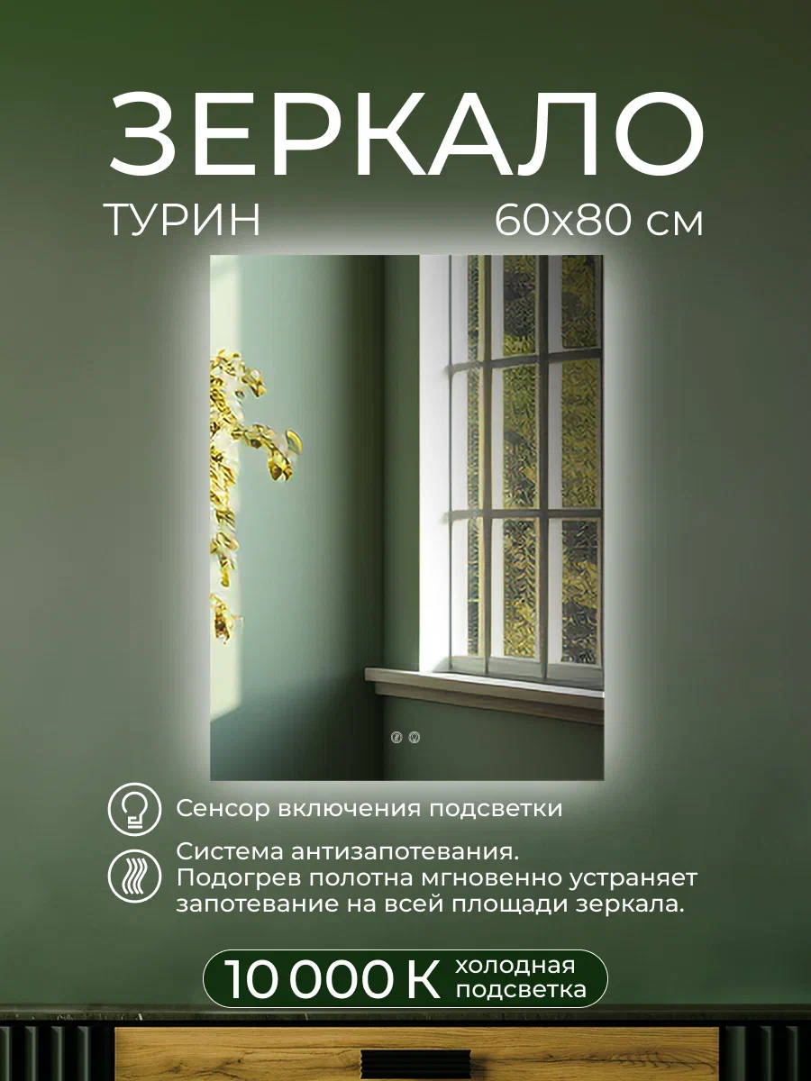 Зеркало с подсветкой в ванную Турин 60х80 с регулировкой яркости подсветки, сенсор на касание, подсветка внутри полотна по всему периметру зеркала, направленный свет для комфортного использования зеркала при нанесении макияжа/бритье и т.д., не искажает тон кожи. Ремонтопригодность (легкая замена комплектующих).