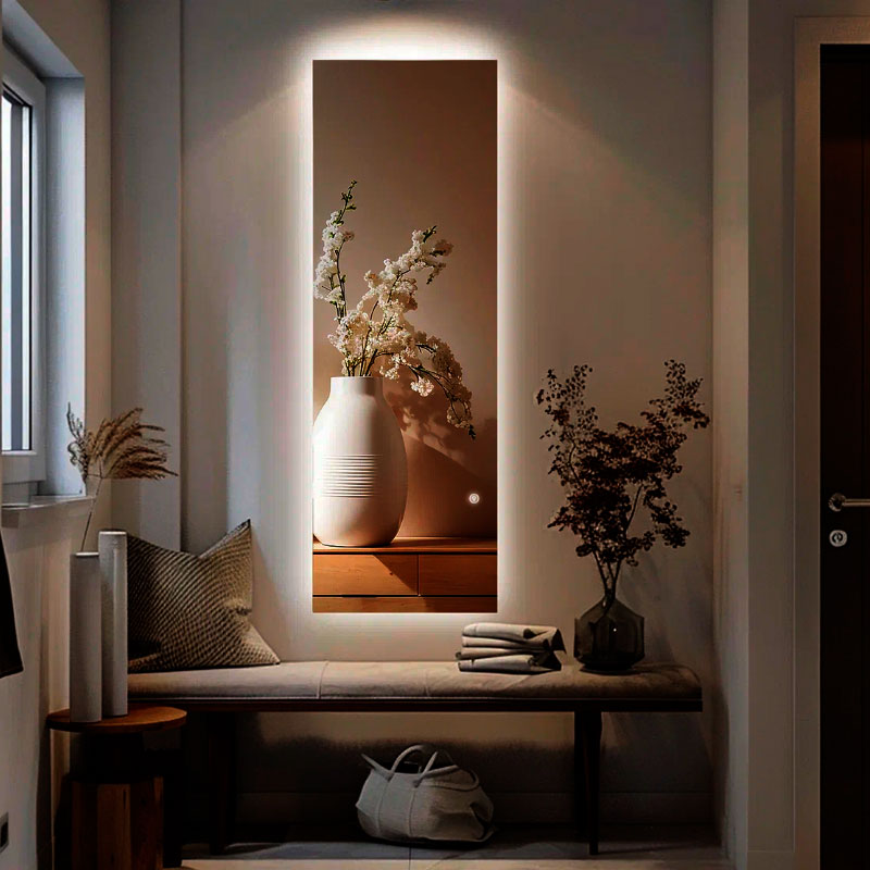 Зеркало с подсветкой Турин Гранд Лайт 50х150 с регулировкой яркости подсветки, сенсор на касание, подсветка внутри полотна по всему периметру зеркала: направленный свет для комфортного использования зеркала при нанесении макияжа/бритье и т.д,, не искажает тон кожи.
